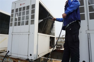 (3)使用高壓水槍沖洗空調外機,注意不要讓水進入空調內部。